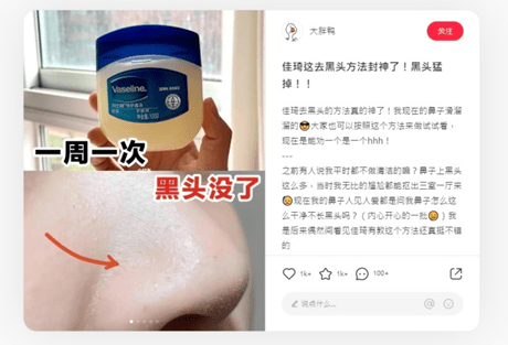 一心想去黑頭深層清潔嘅我,第一件事就上網睇下有無咩日常護理先,比我搵到一個小紅書瘋傳嘅凡士林去黑頭方法,咁啱屋企又有凡士林,所以就順利成章咁試下啦,反正又好易就可以做到。