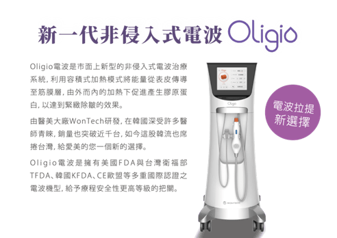 Oligio玩美電波喺香港比較新,而台灣方面就係搵咗小S做代言人,佢原理係透過單極射頻(科技,用立體加熱原理將真皮層加熱,可以從肌底刺激膠原蛋白新生,好有效令肌膚持續新生膠原,回復彈力緊緻,有提升輪廓、緊膚、去紋嘅效果。